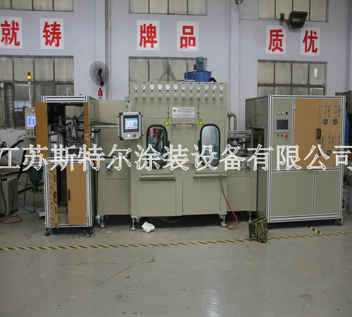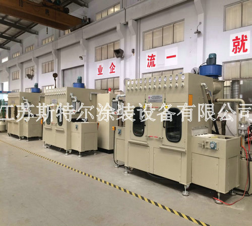 全自動玻璃水砂自動噴砂機由自動上料機、自動噴砂機和自動下料機三大部分組成:首先由自動上料機將附有兩組Tray盤Port可自動交換,需人工放Tray盤至LD Port, Tray盤定位后,移栽Arm開始取片,玻璃整列,再由移栽Arm直接將玻璃放置在載具Stg上,送入噴砂設備,當一個Tray port 取完后,會報警提醒人員裝載新的Tray盤,當空Tray盤滿杯后設備會自動報警通知人員取走空Tray盤,以此循環動作.然后到全自動玻璃水砂自動噴砂機,由人工自行調配一定的水砂比例后設備自動進行混合攪拌,自動上料機構抓取玻璃放到輸送同步帶上,進入噴砂機腔體進行噴砂,噴砂作業結束后,進入水刀處進行噴淋,噴淋結束后由風刀進行吹干。吹干后移動至下料機移栽位置,由移栽將玻璃抓取至下料機FORK上,以此循環。噴砂、清洗、吹干區域有擋邊防止工件位移。最后自動下料機將附有兩組CST Port可自動交換,需人工放空的CST至UnLD Port, CST翻轉90°后,氣缸機械定位,由移栽arm從治具上取玻璃放置Fork上,送入CST, CST Port內的基板利用Fork方式由最高層開始放片,Fork 真空感知Sensor/玻璃光纖sensor OFF后,Fork自動退回到等待位置,以此循環。當CST裝滿后,設備會報警提示人員將CST取走并裝入空的CST。